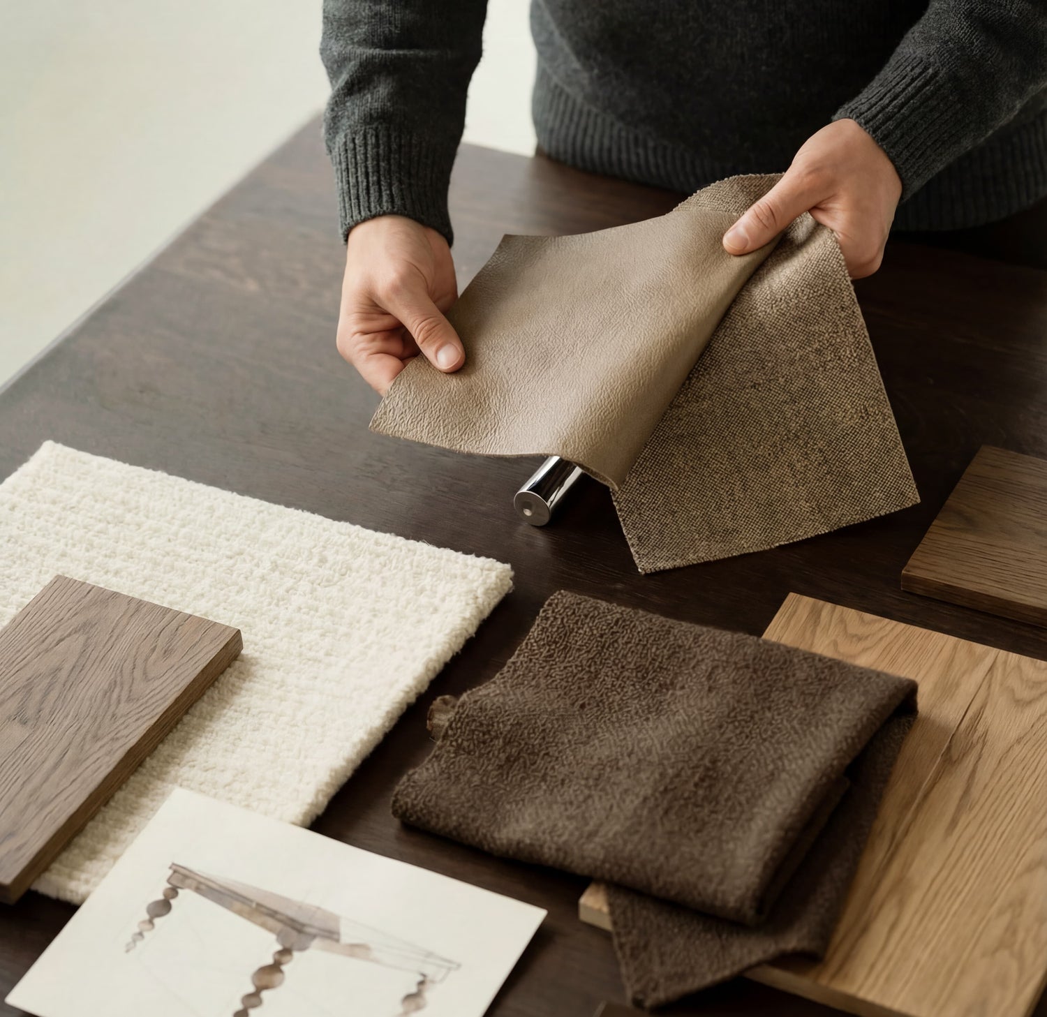 Explore our fabrics and wood selections in your home with a thoughtfully curated sample box, delivered directly to you.